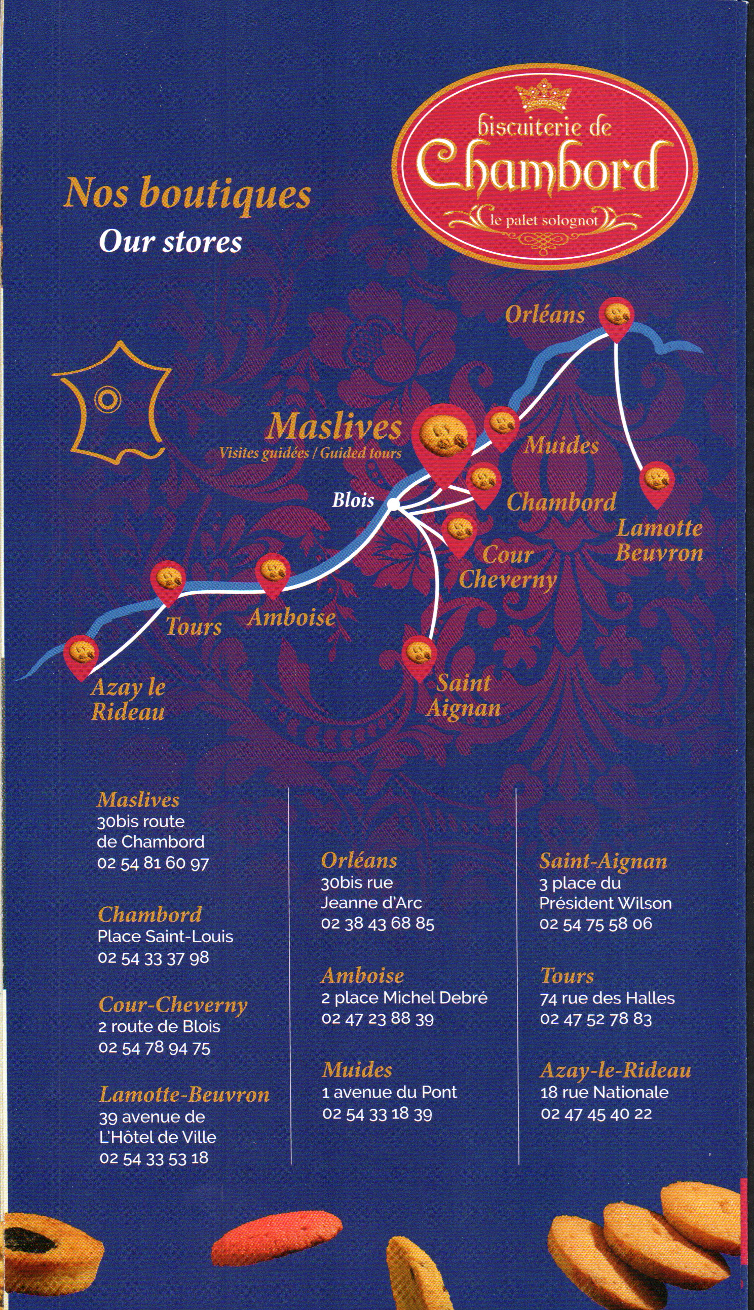 Depuis plus de 40 ans, la biscuiterie de Chambord, située à Maslives, aux portes du château de Chambord, vous propose des recettes gourmandes de biscuits réalisées à partir de produits rigoureusement sélectionnés. Vous y trouverez également un grand choix des meilleurs produits du terroirs, vins régionaux et coffrets cadeaux.
